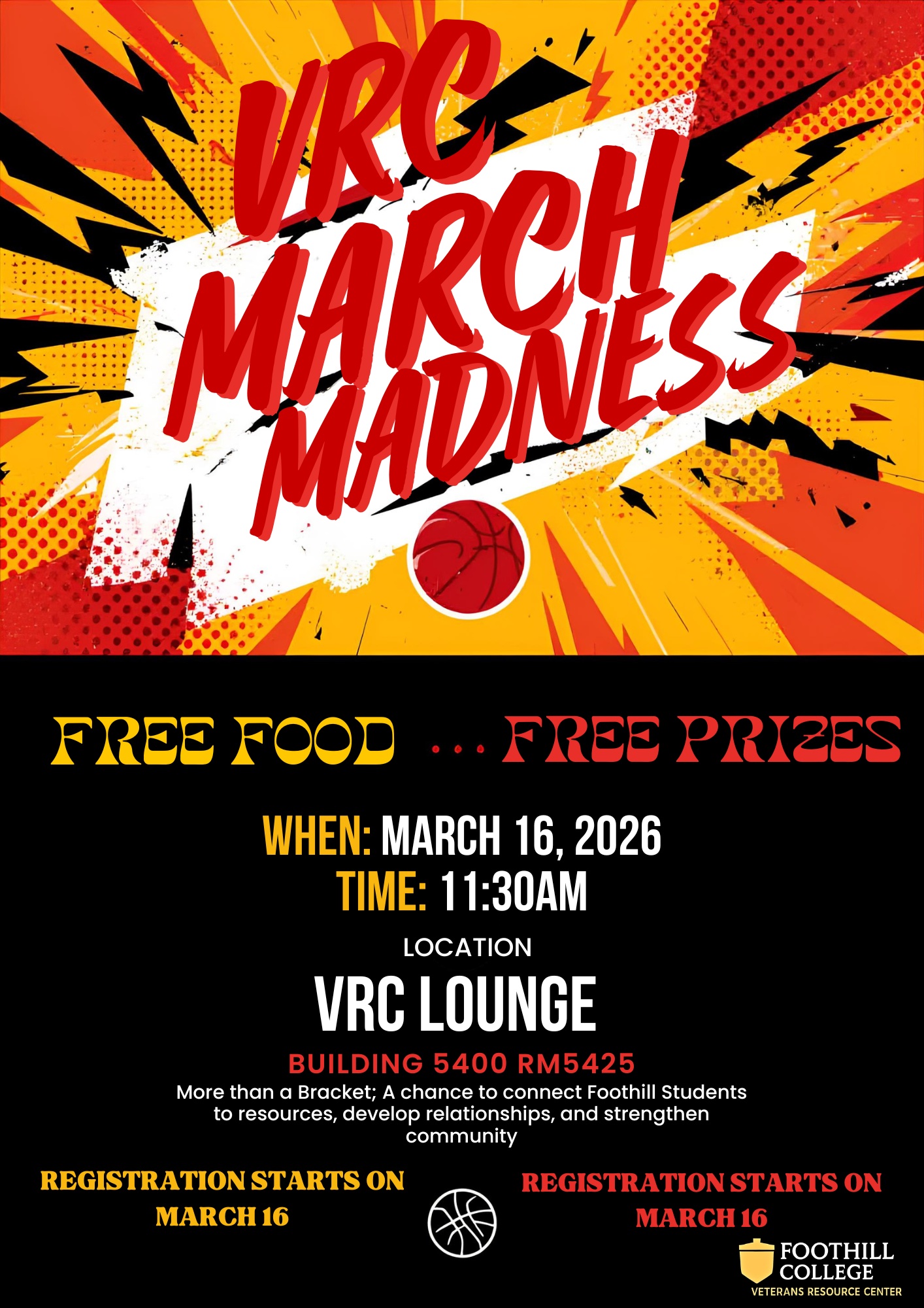 Open to all Foothill College veterans, military affiliated students, and supporters (students, staff & faculty)! For more details click on flyer link or call 650-949-7912. VRC March Madness Flyer